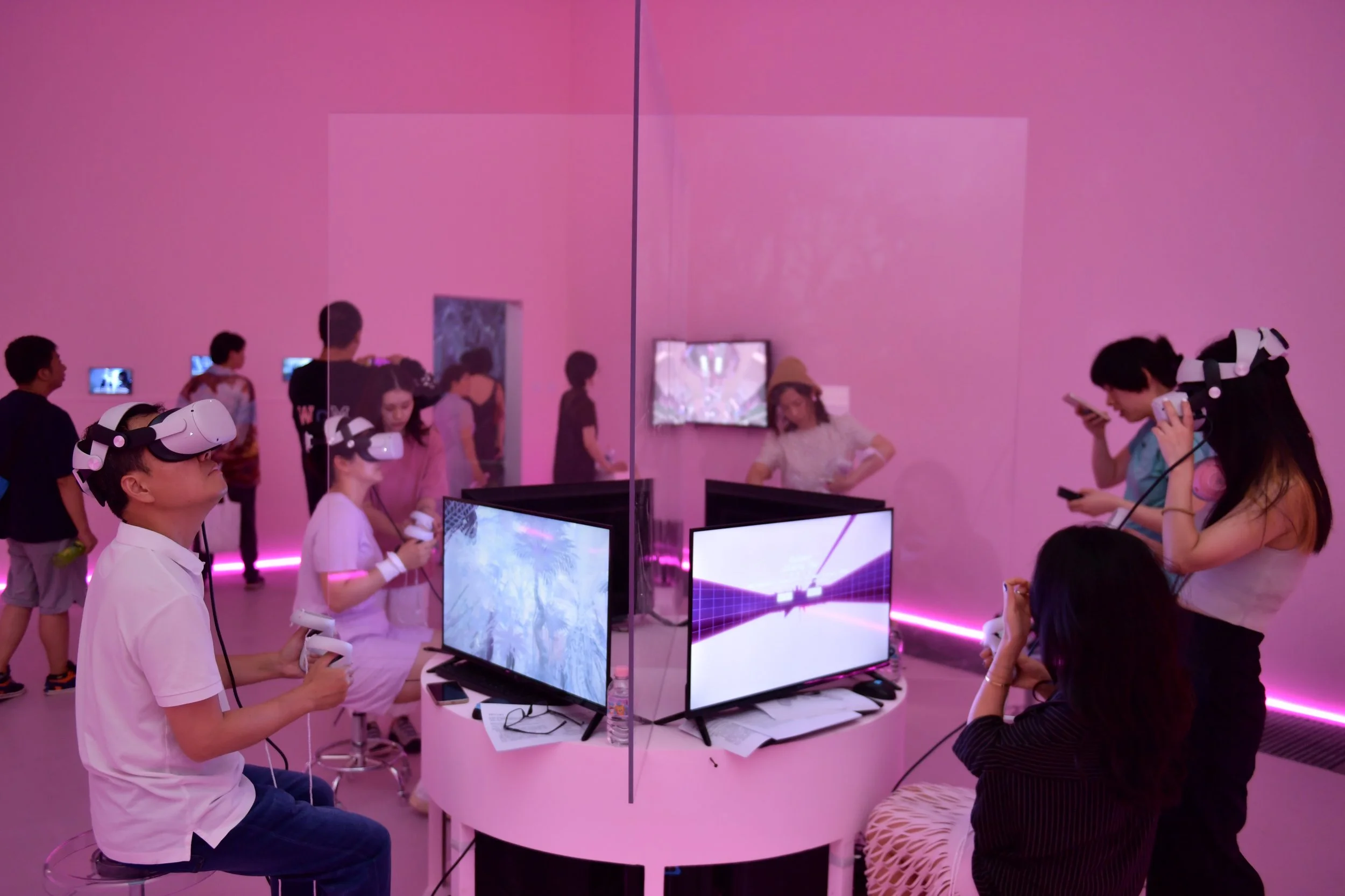 Cyber JiangHu is a VR GameArt experience. In this work, the artist establishes a speculative future world, using an immersive virtual interactive environment as a "mirror apparatus" that influences the participant's cognitive processes to explore its impact on emotions and perceptions at various stages. Inspired by Luce Irigaray's concept of "mimesis," the artist emphasises the use of"active superficiality"as a method to highlight the narrative power of "cuteness" within minor aesthetics. The work also heavily utilises techno-pink and fuzzy textures, creating a sensory conflict with the audience's expectations of future imaginaries within the digital virtual system. Additionally,Cyber JiangHu has no overarching narrative; participants form their narratives and perceptions of identity and gender by gathering fragmented information and interacting with the coding system in the process of engagement and negotiation. All the voices, as well as some 3D models and textures in the work, are AI-generated. Throughout this performative worlding process, every "intra-action" (Karen Barad, 2006, p.185) between human and non-living entities is crucial for knowledge-making and remaking.