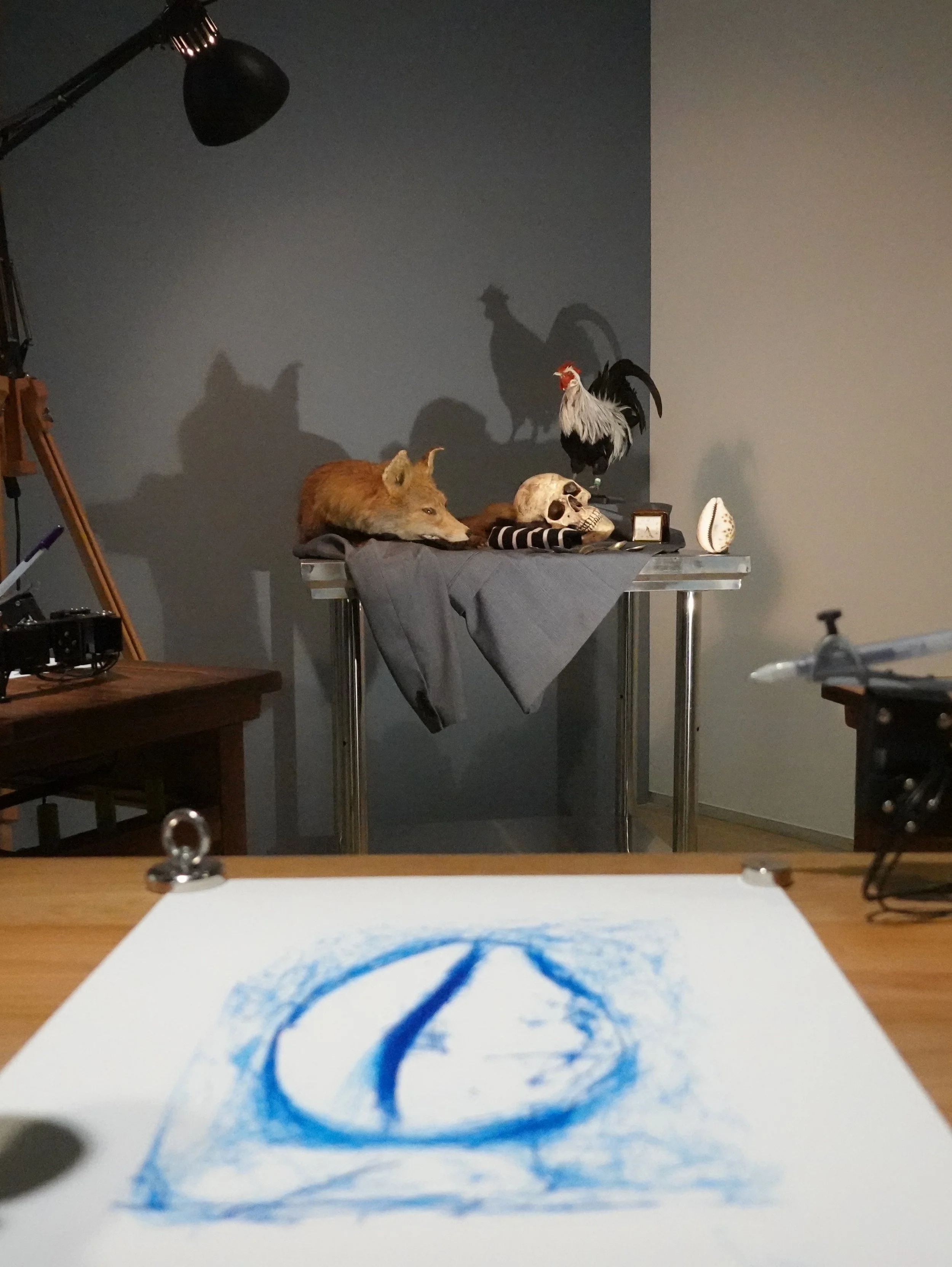 Each installation of the Human Study #2 series features a unique selection of objects in its still life, while consistently including two constants: the shell and the skull. The objects are chosen for their ability to evoke something meaningful for me, and therefore have the potential to do so for others as well. They trigger biographical memories, fables, symbols, etc., to provoke a multilayered poetic experience. The still-life elements are arranged to create a strict composition as if it was for a painting, and to further facilitate intimate storytelling.