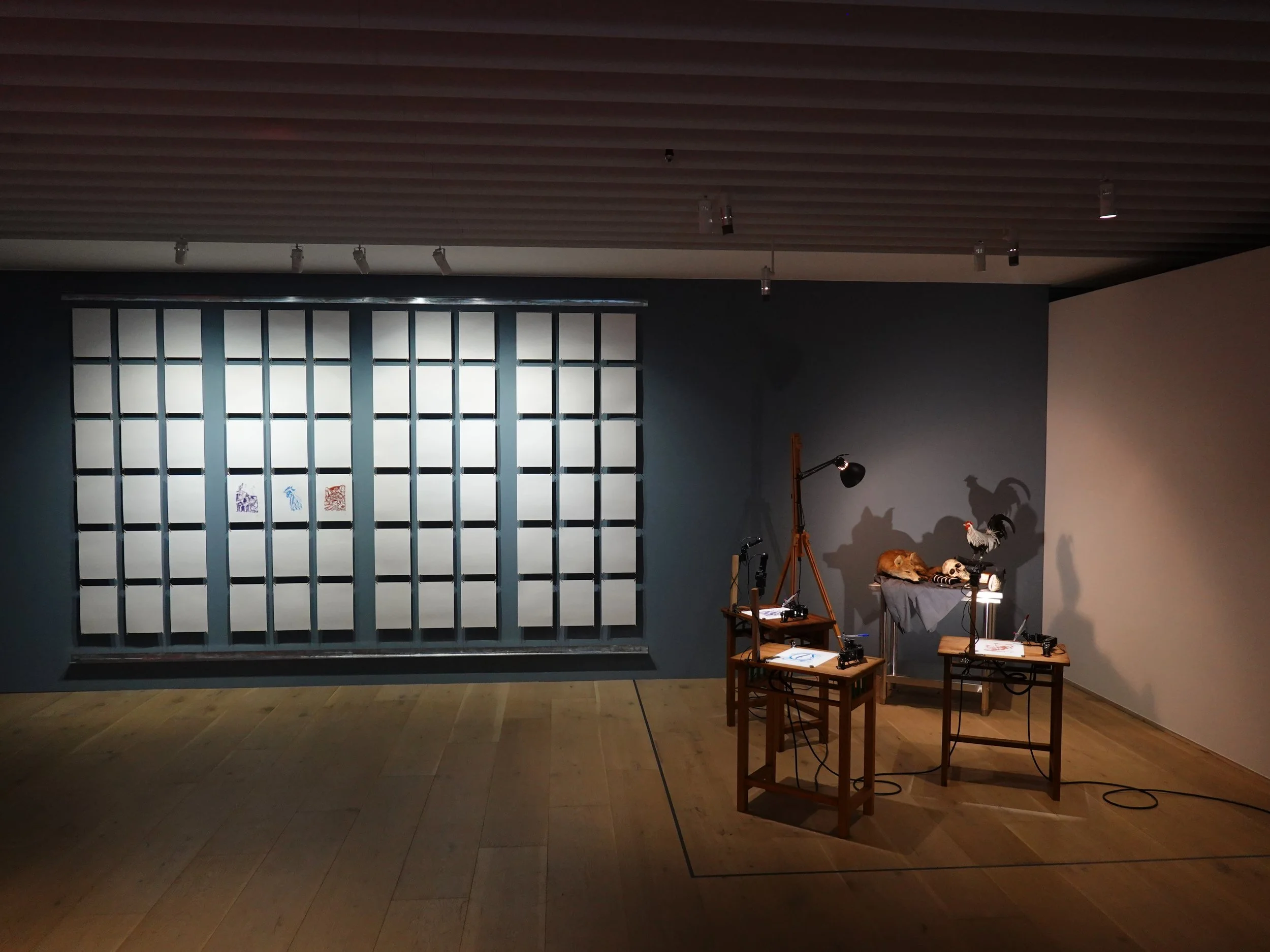 Human Study #5 A large table with two ambidextrous mobile robots of the RNP-A series are busy scribbling on a large sheet of paper, from time to time they look around and fixate few seconds on human visitors. The large drawings tracesof the visitors’ presence are progressively hung on the walls.